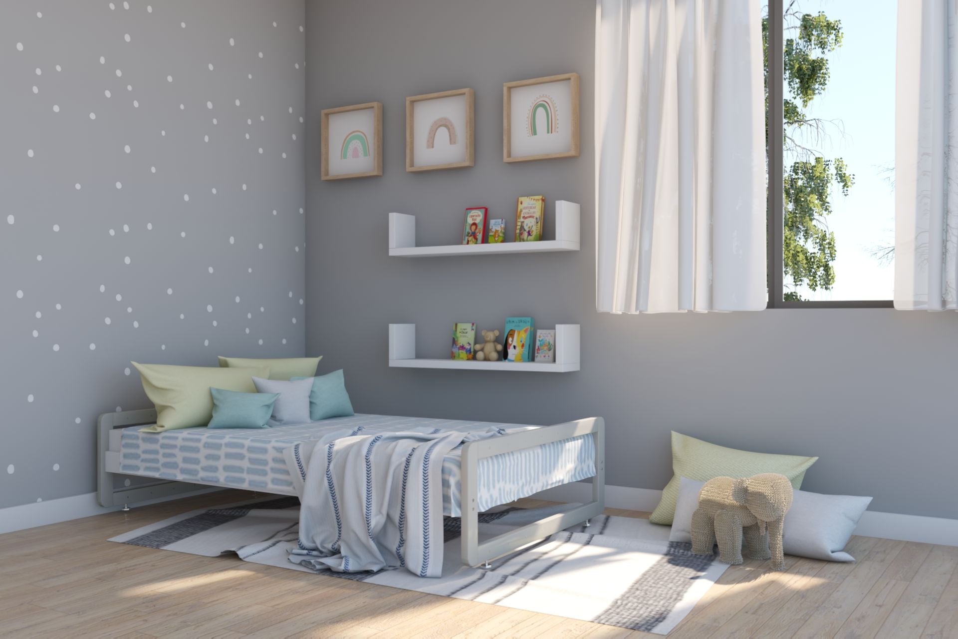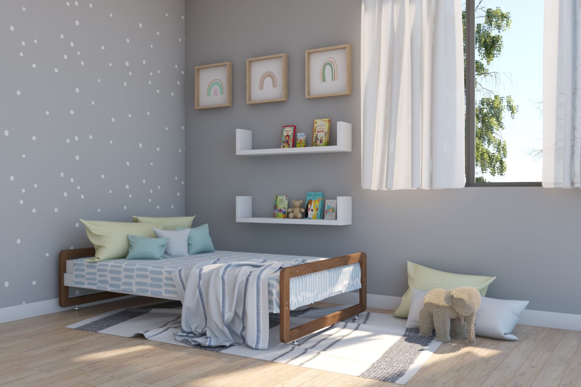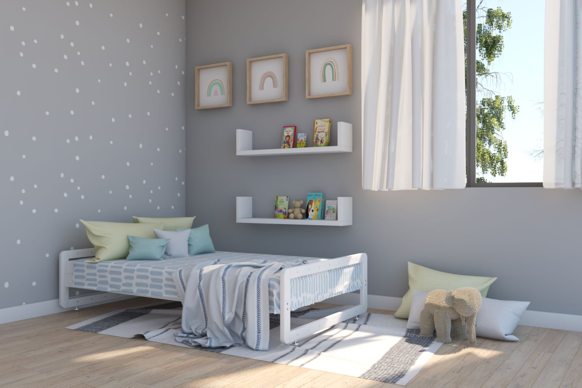 Cama Montessori individual, de altura baja, ideal para la transición de cuna a cama estándar, así desarrollar la autonomía de tu pequeño.
