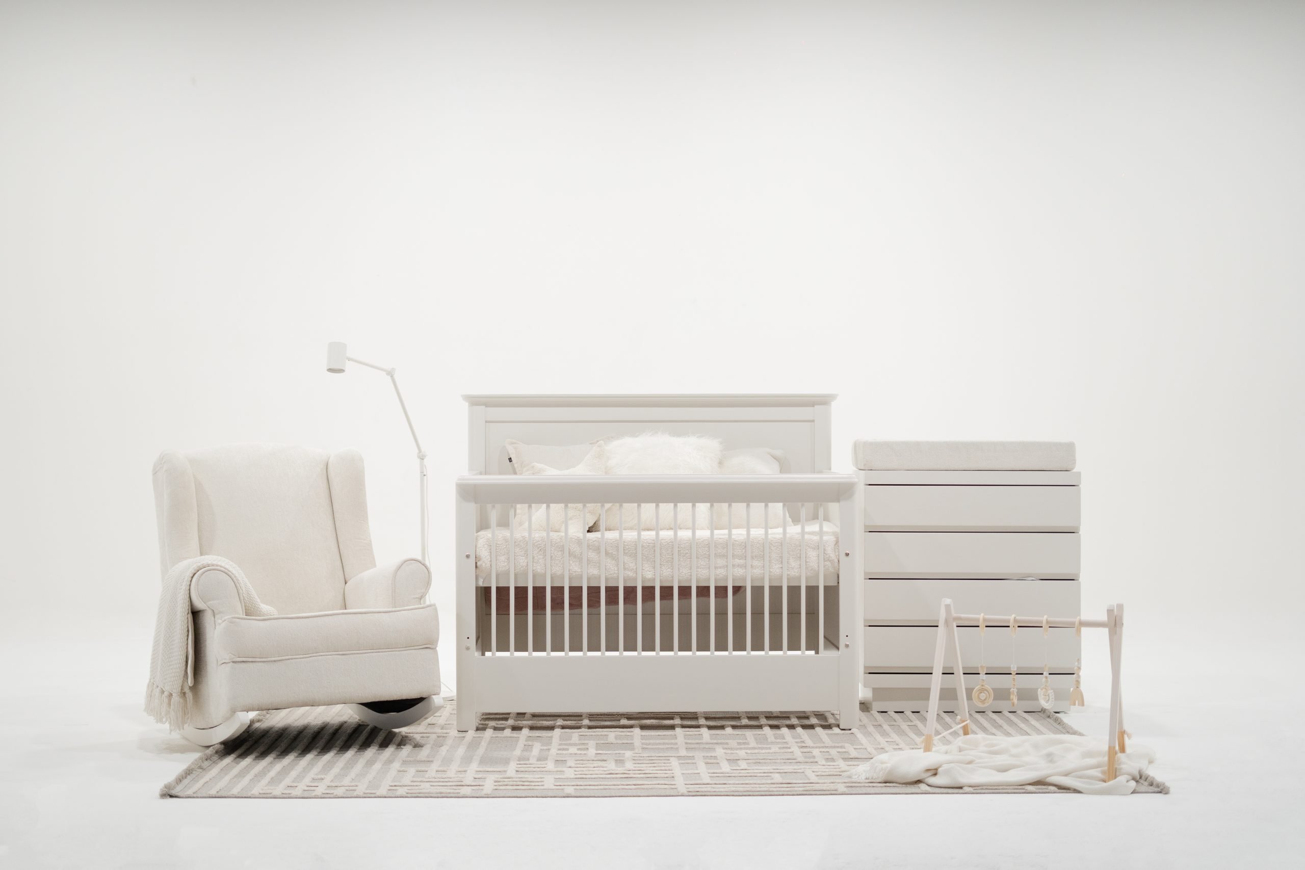 Cuna Entrenadora: Retira el barandal/piecera, coloca el colchón en la posición más baja, revisando que el larguero esté también en esta posición y coloca el medio barandal, así tu bebe podrá entrar y salir por sí mismo, sin el peligro de caerse mientras duerme.