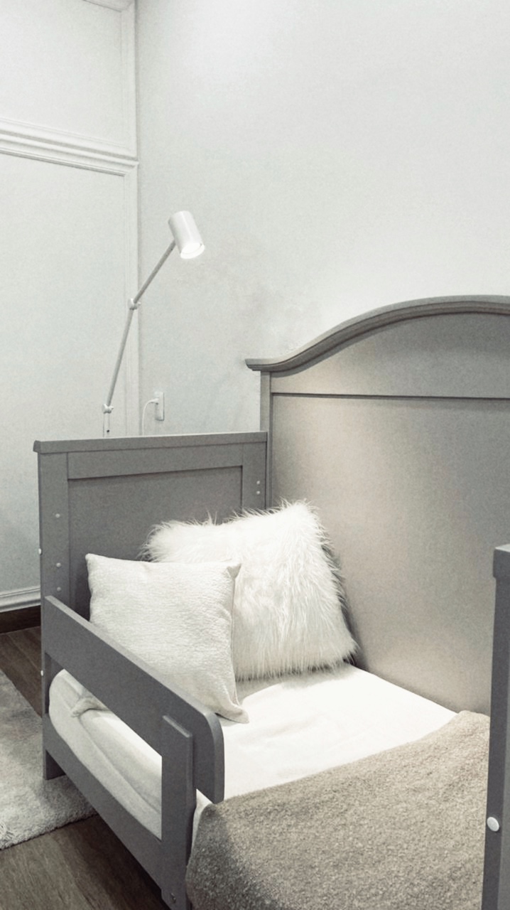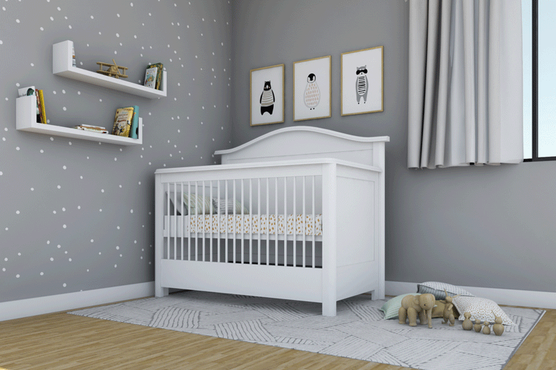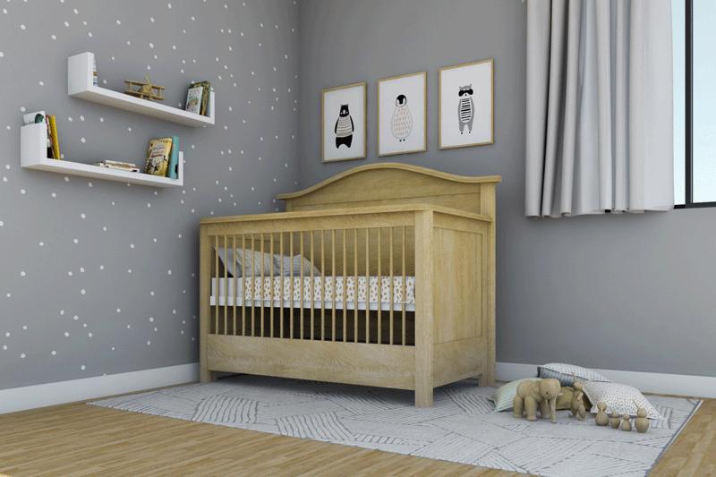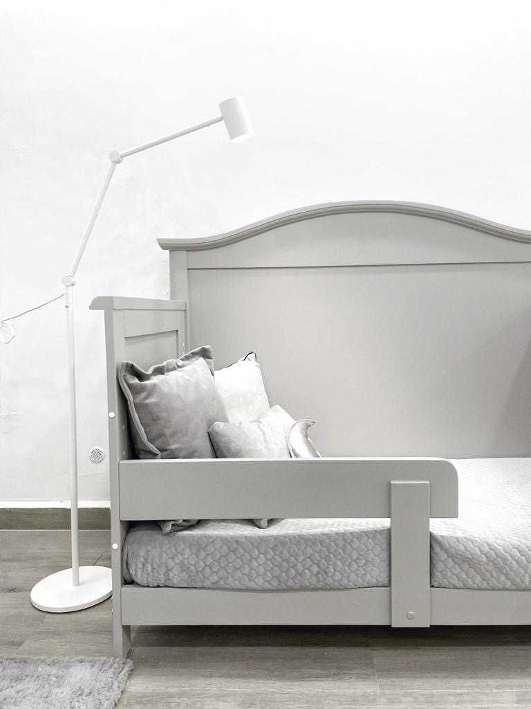 Cuna Entrenadora: Retira el barandal/piecera, coloca el colchón en la posición más baja, revisando que el larguero esté también en esta posición y coloca el medio barandal, así tu bebe podrá entrar y salir por sí mismo, sin el peligro de caerse mientras duerme.